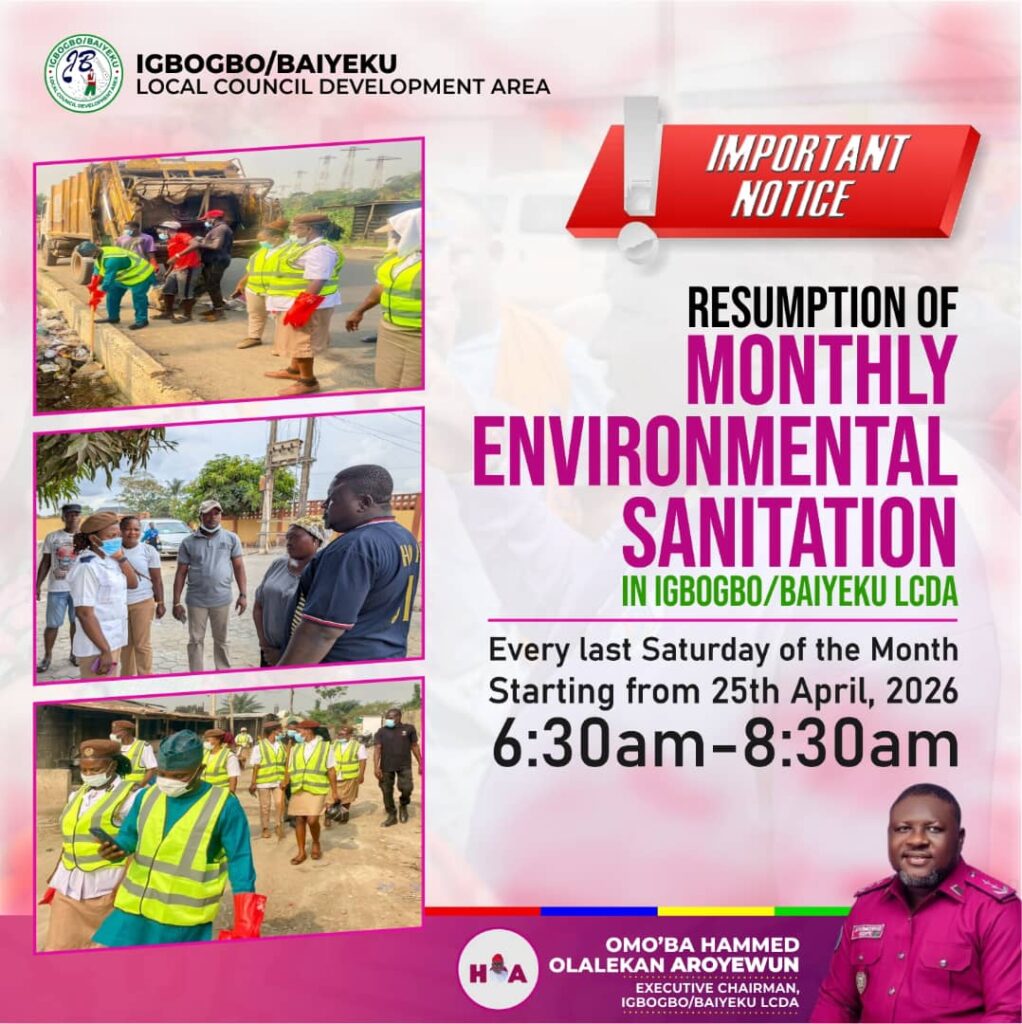 Igbogbo/Baiyeku Local Council Development Area (IBLCDA) has officially announced the resumption of the Monthly Environmental Sanitation Exercise, in line with the Lagos State Government’s directive under the leadership of Governor Babajide Sanwo-Olu.