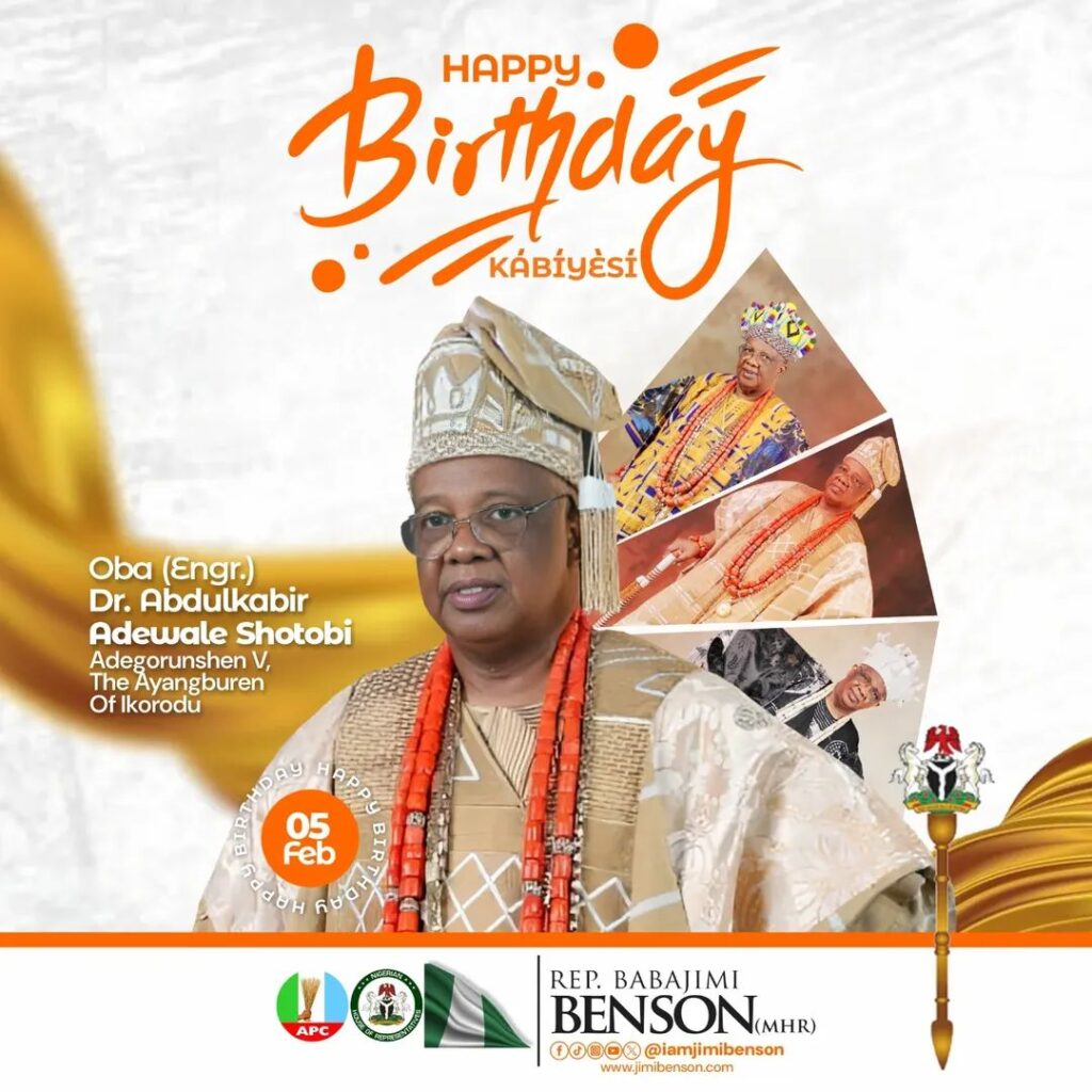 Ikorodu Federal lawmaker, Rep Babajimi Benson has celebrated the revered Ayangburen of Ikorodu, Oba Engr. Dr. Kabiru Adewale Shotobi GCIO on his birthday today, 5th February.