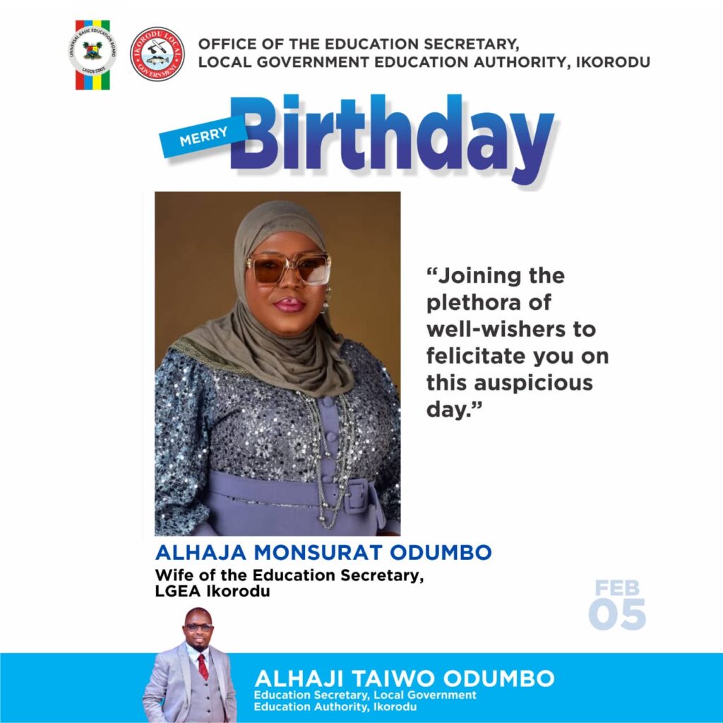 The Ikorodu Local Government Education Secretary, Alh. Taiwo Odumbo is presently in a romantic mood, as he pens down an emotional ‘love note’ to his beautiful wife, Alh. Monsurat Odumbo who clocks 50 today.