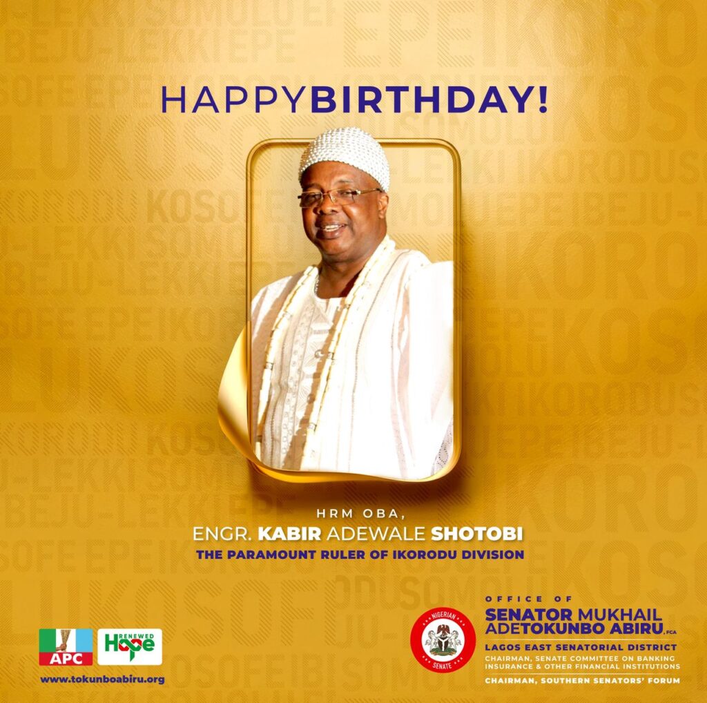 On behalf of the good people of Lagos East Senatorial District, we extend warmest felicitations and heartfelt goodwill to our revered royal father, His Royal Majesty, Oba (Engr.) Kabir Adewale Shotobi, Adegorushen V, the Ayangbure of Ikorodu, The Paramount Ruler of the Ikorodu Division, and Vice Chairman of the Lagos State Council of Obas and Chiefs, on the joyous and auspicious occasion of his birthday.