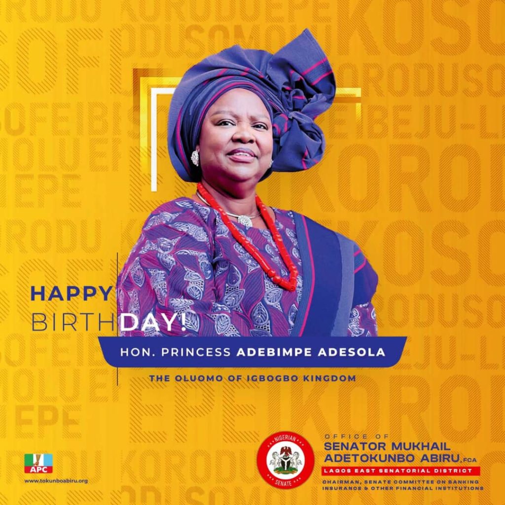 Senator, representing On behalf of the people of Lagos East Senatorial District, we extend warmth congratulations to a dependably ally, an accomplished grassroot politician and seasoned public servant , Hon. (Princess) Adebimpe Akinsola, The Oluomo of Igbogbo Kingdom, on the occasion of her birthday.