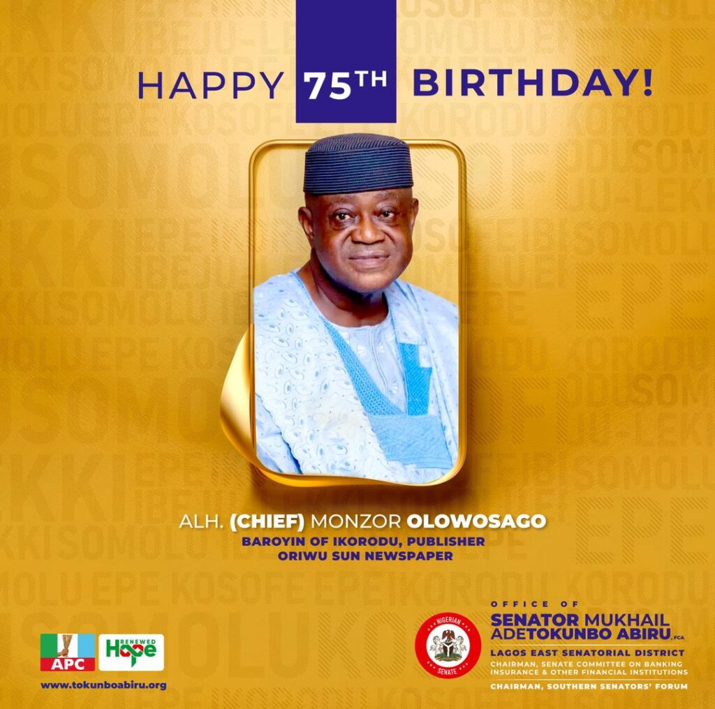 On behalf of my family and the good people of Lagos East Senatorial District, I heartily celebrate a distinguished icon of community journalism in Nigeria, Chief (Dr.) Monzor Kolawole Olowosago, the Baaroyin of Ikorodu and Publisher of Oriwu Sun Newspaper, on the occasion of his 75th birthday.