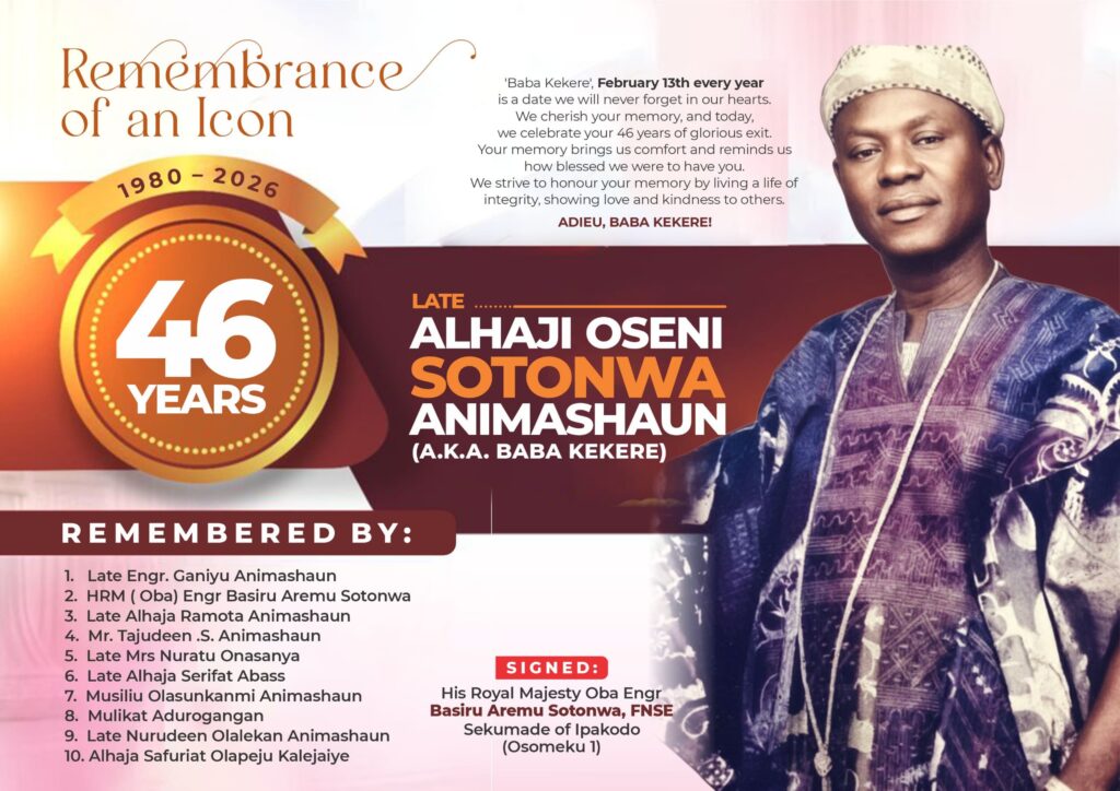 In a special remembereance publication on The Punch Newspapers of Friday, 13th February, signed by the Sekumade of Ipakodo, Oba Engr Basiru Aremu Sotonwa, FNSE on behalf of the entire family, they paid a glowing tribute to their late icon.